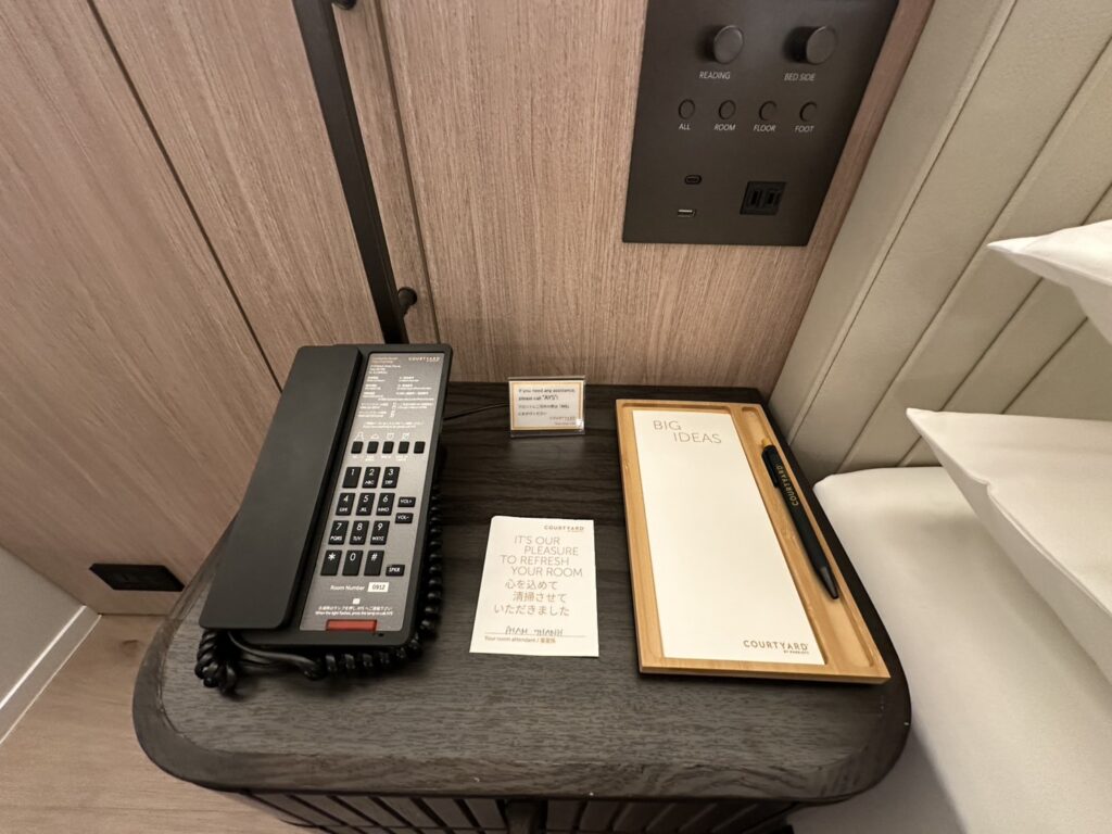 フロントにつながる電話とメモ帳!ボールペンは紙製でオシャレでした!