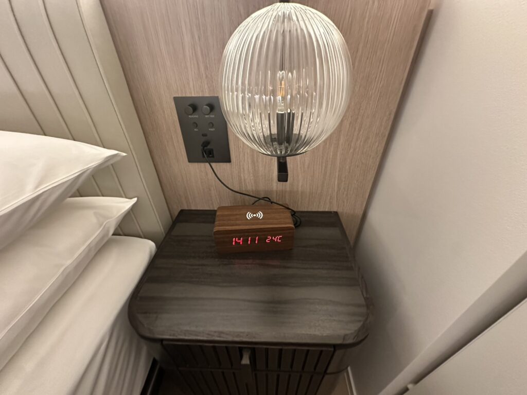 ベッドサイドテーブルのランプもおしゃれな雰囲気ですね!