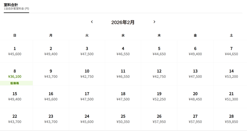 1部屋を2人で泊まると検索してみたらこのような結果になりました!一番安い日だと24,000円!とり丸的にはこの値段であれば全然泊まりたいなと思う金額ね!ただ高い日は45,000円とかするからここまで高いとちょっと手が出ないかなぁ。。。